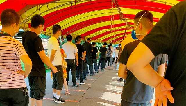 按照防疫指引,實行員工(gōng)錯位就餐。為(wèi)确保疫情期間用(yòng)餐安(ān)全,公(gōng)司實行疫情期錯峰就餐原則,員工(gōng)進入食堂、排隊打餐需全程佩戴口罩,用(yòng)餐時,一桌不超過兩人,采取每桌2人斜對角落座的方式就坐(zuò)。